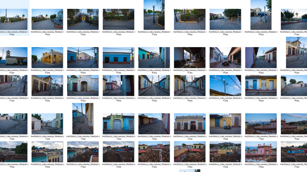 This pack contains 231 high quality 6k photos, shot in the Cuban cities of Havana and Trinidad, at different times of day. Shots vary from 24 to 70mm.