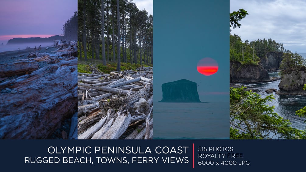 This pack contains 515 high quality 6k photos, shot in various locations in the Olympic Peninsula, in Washington State. The pack walks you along wild beaches, rugged coastlines, embarks you on ferry trips in the Puget Sound, and even features an intense smoky sunset during the fire season. With closeups and wider shots, focal varies from 24 to 120mm.